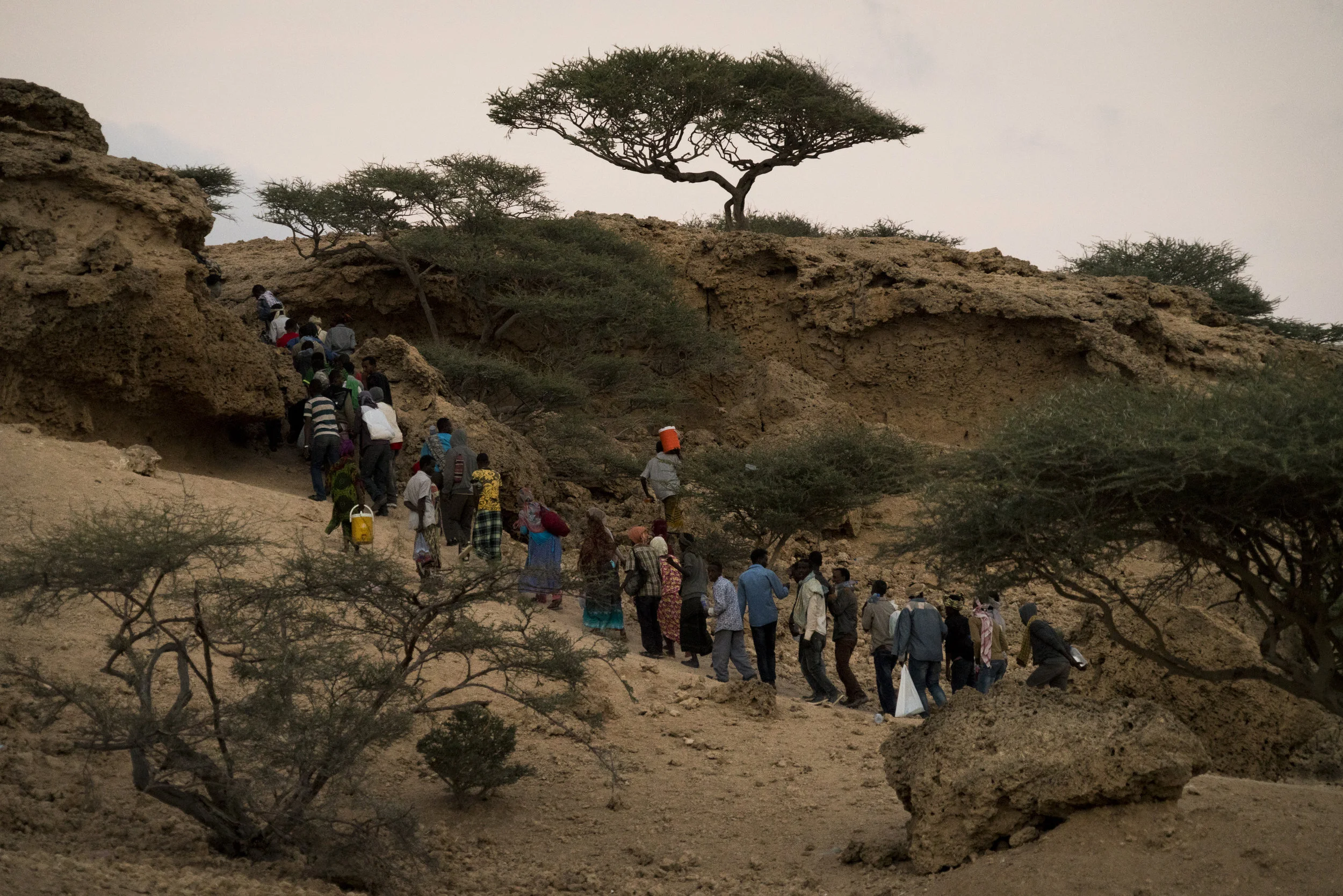 Ethiopians, Somalis, Sudanese, and Eritreans are fleeing their countries and crossing the desert to Djibouti’s port town of Obock. Their goal is to make it to Yemen and then into Saudi Arabia to find work cleaning houses or driving taxis. The migrants camp out under trees until the group grows large enough to fill a boat, and, at dusk, a trail of migrants disappears over a ridge, hopefully on to a better life.